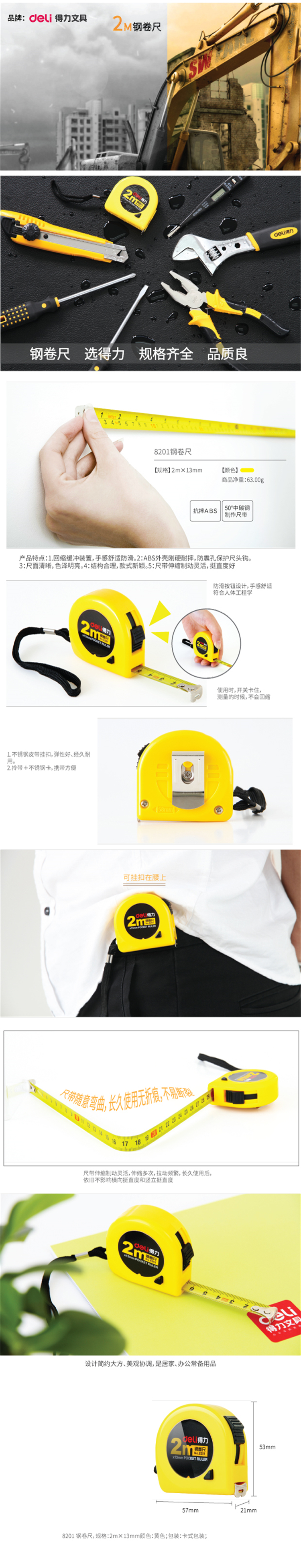得力 8201 钢卷尺2m*13mm(单位:把)黄