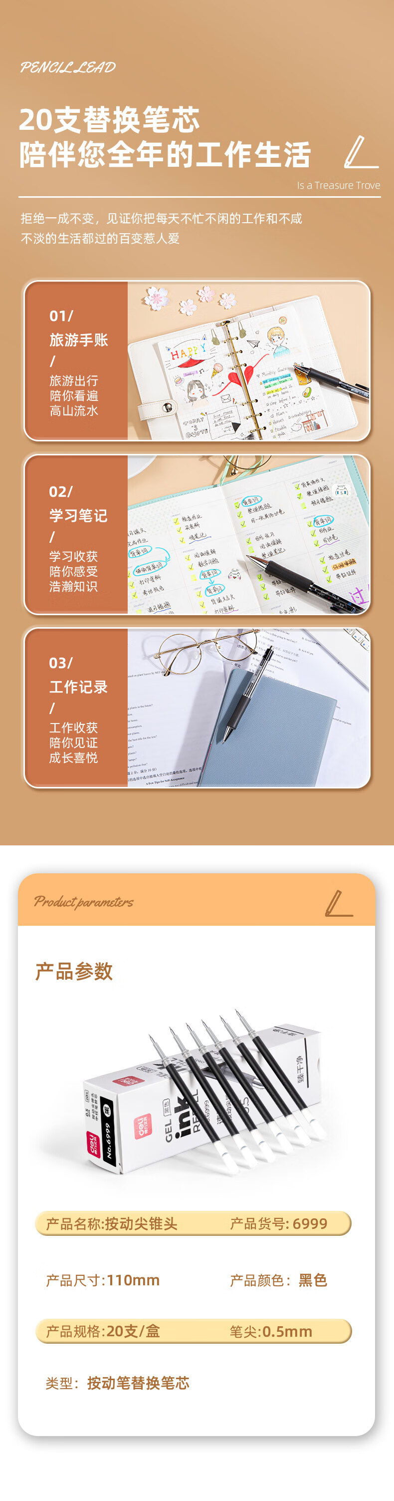 商品标题:得力6999中性笔替芯速干按动尖锥头0.5mm(黑)(支)
