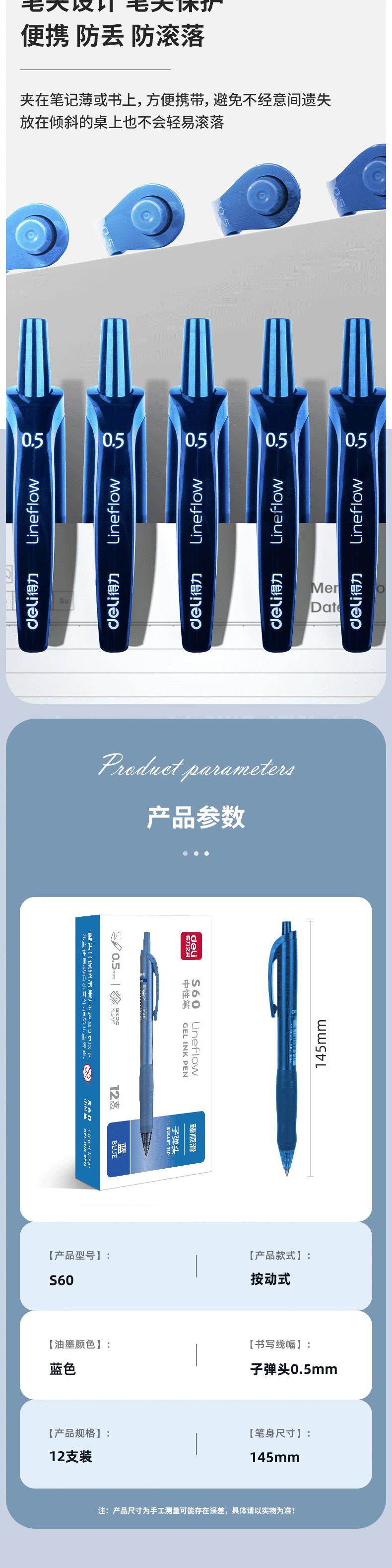 得力S60臻顺滑办公中性笔0.5mm子弹头(墨蓝)(支)