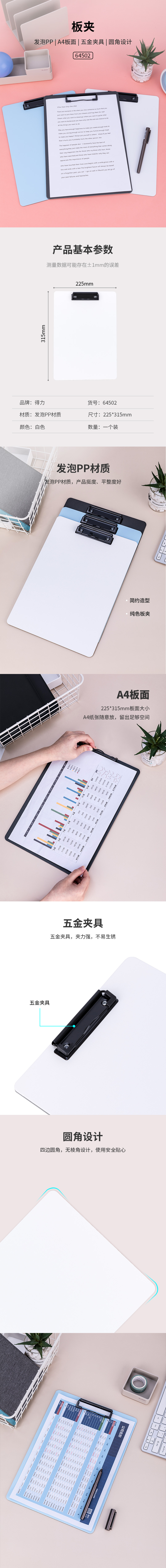 得力64502板夹A4 225*315mm(白色)(单位:个)