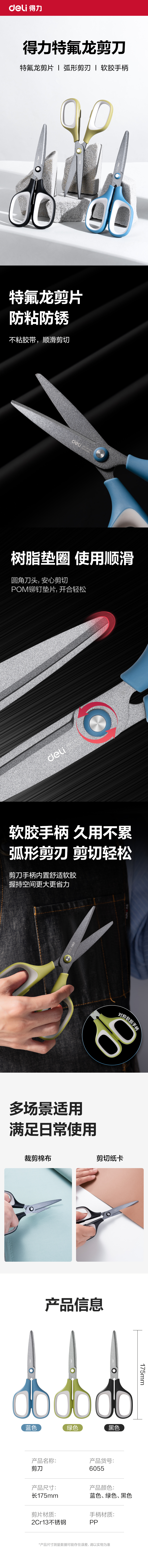 商品标题:得力(deli)6055 175mm特氟龙剪刀(单位:把)绿