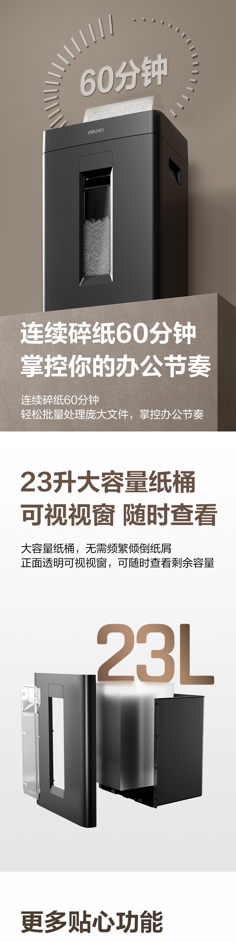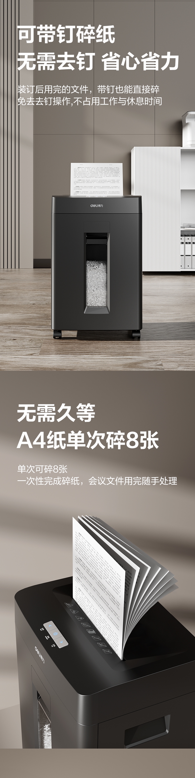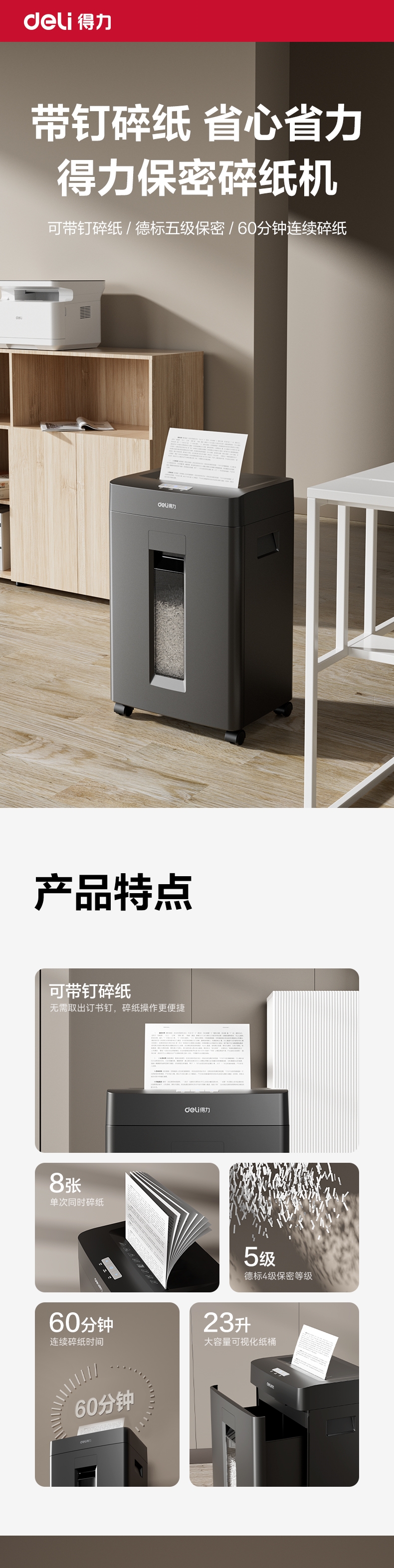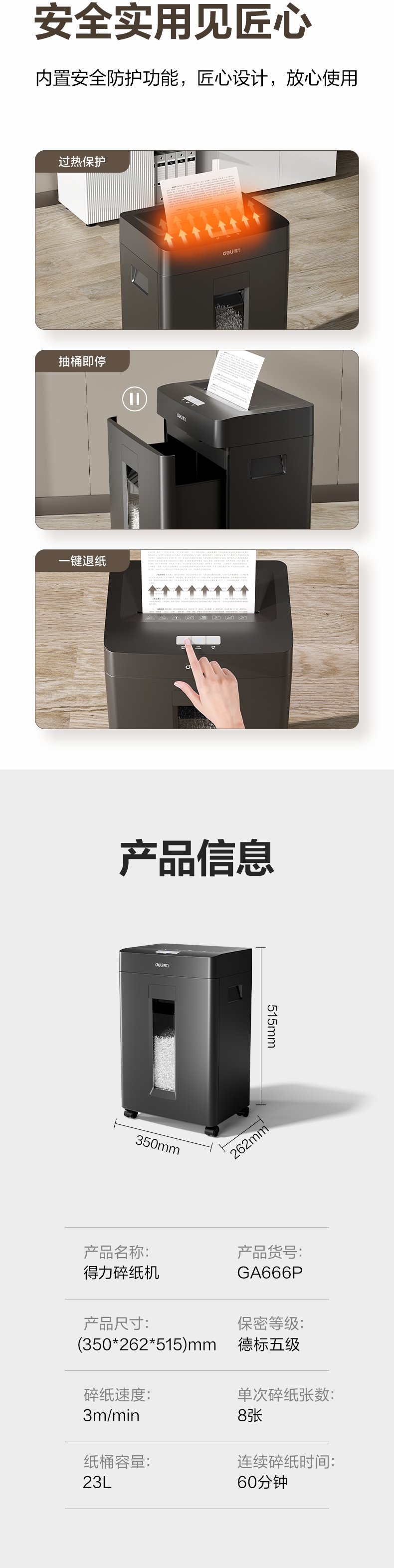 得力GA666P碎纸机-商务碎纸机(黑色)(台) 5级保密 单次8张 23L可视容量 60分钟碎纸时间(黑色)
