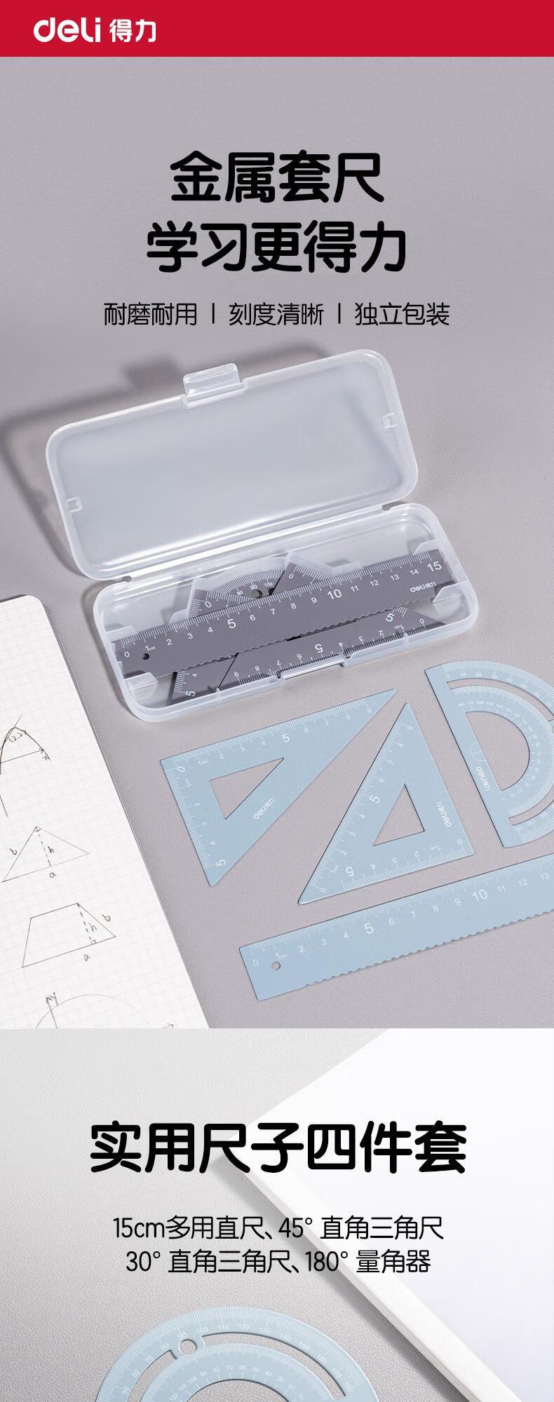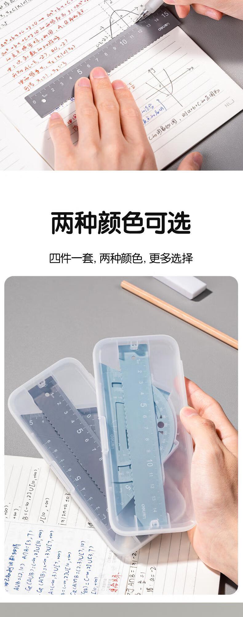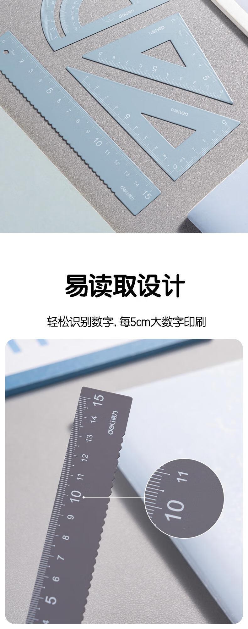 规格:45°直角三角尺+30°直角三角尺+15cm直尺+量角器