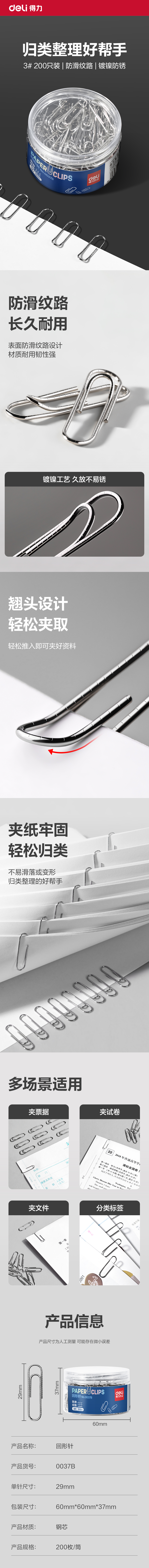 商品标题:得力0037B办公专供防滑回形针(银)(筒)