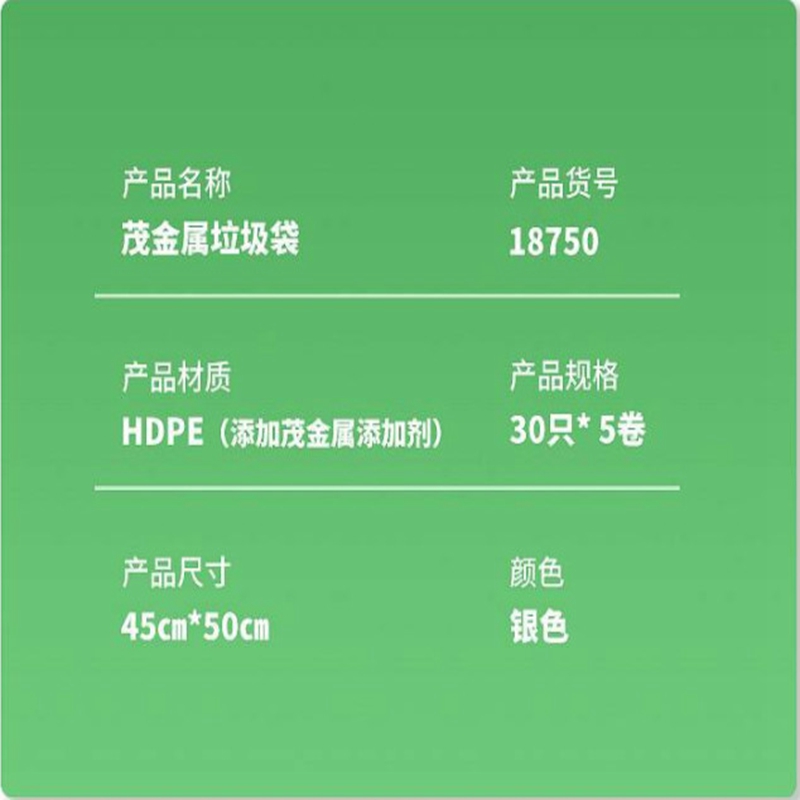 商品标题:得力18750茂金属垃圾袋45*50厚0.01mm(银色)(5卷/包)