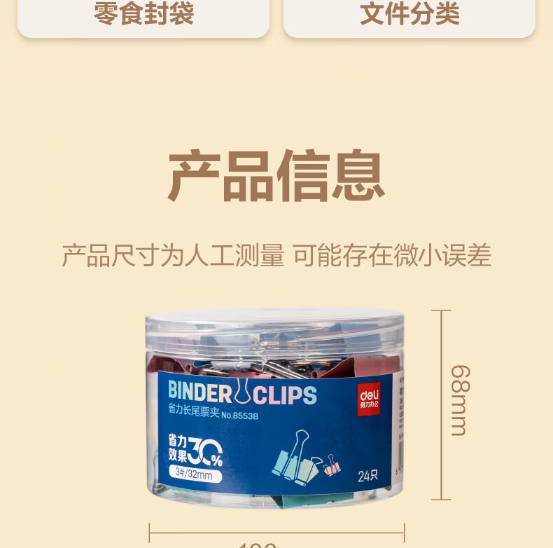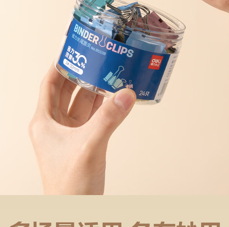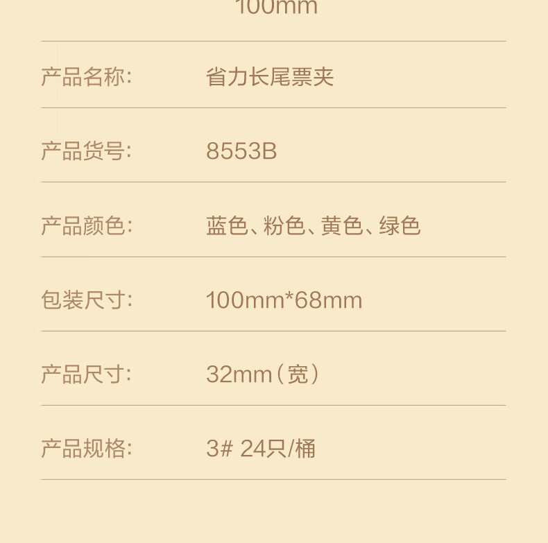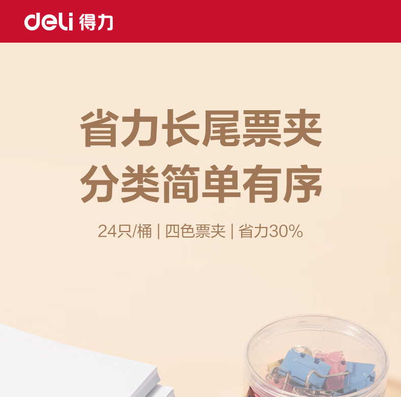 商品标题:得力8553B省力长尾票夹(混)(筒)