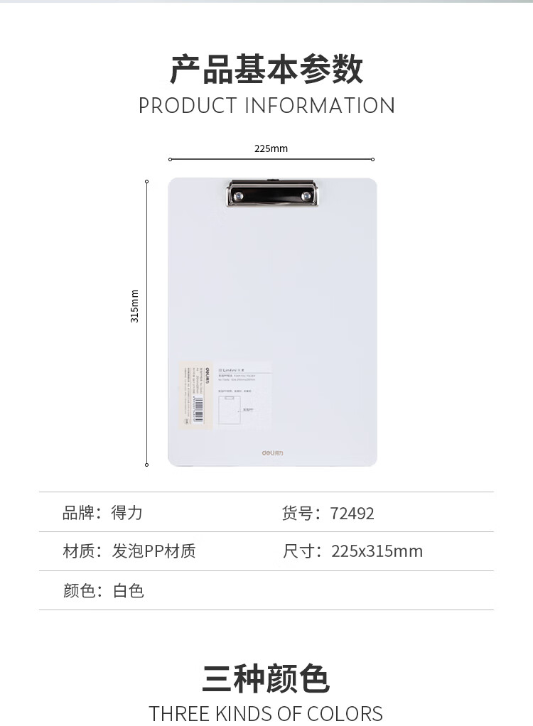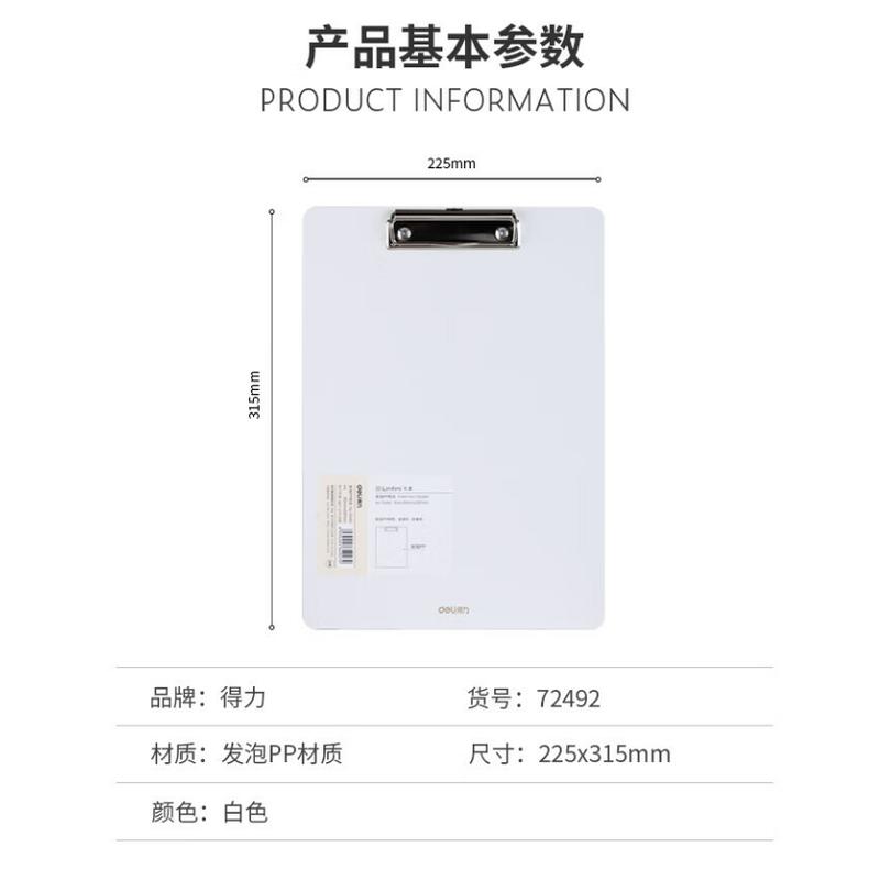 商品标题:得力72492板夹 A4 315*225mm(单位:个)白色