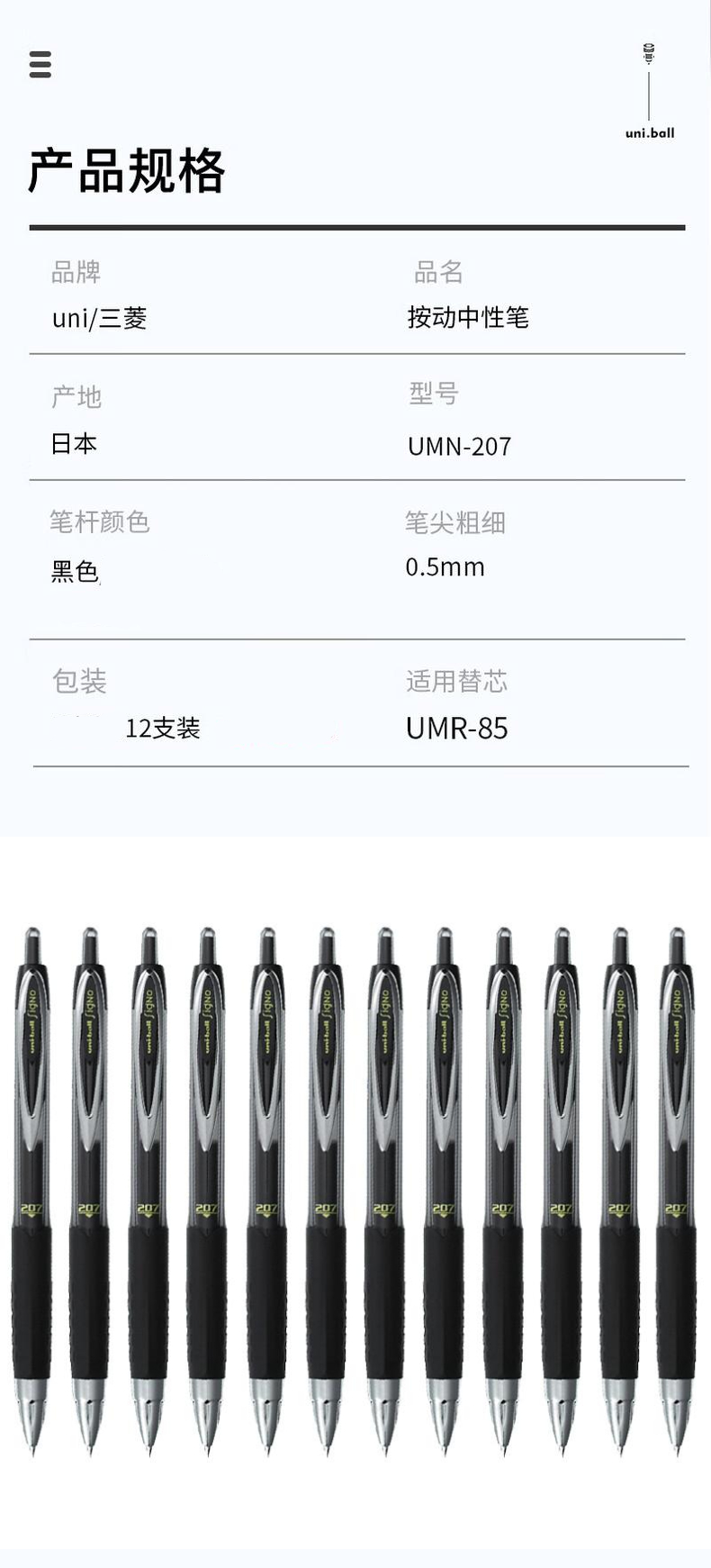 商品标题:三菱 UmN-207 中性笔 0.5mm 黑芯12支/盒 (单位:盒)