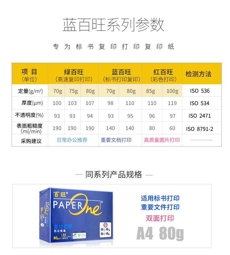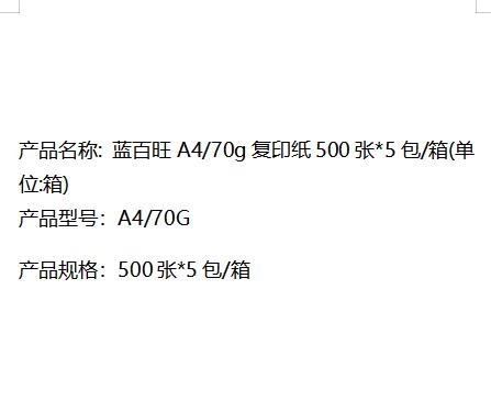 商品名称:蓝百旺A4/70g复印纸500张*5包/箱(单位:箱)