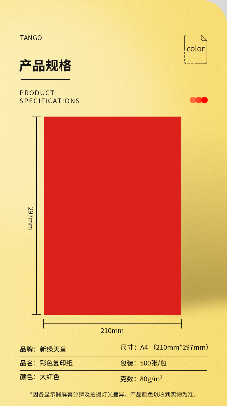 商品标题:新绿天章 P6280 80克/A4/500页(大红)彩色复印纸(单位:包)
