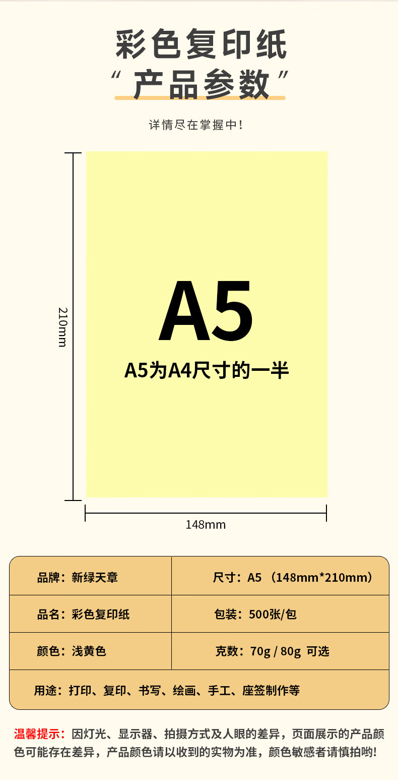 新绿天章P65457 彩色复印纸 70克 A5 浅黄500张/包 (数量:包)