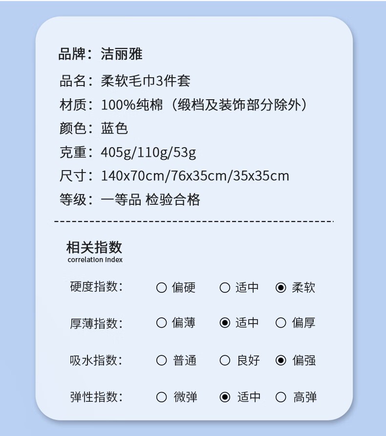 商品标题:洁丽雅(Grace) 140*70cm/76*35cm/35*35cm,3条 浴巾毛巾方巾三件套 毛巾套装 兰色
