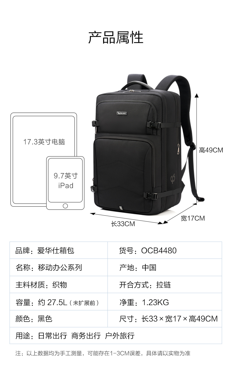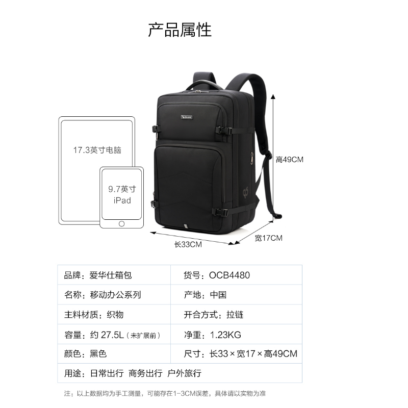商品标题:爱华仕双肩包17.3寸电脑包OCB4480黑色(单位:个)