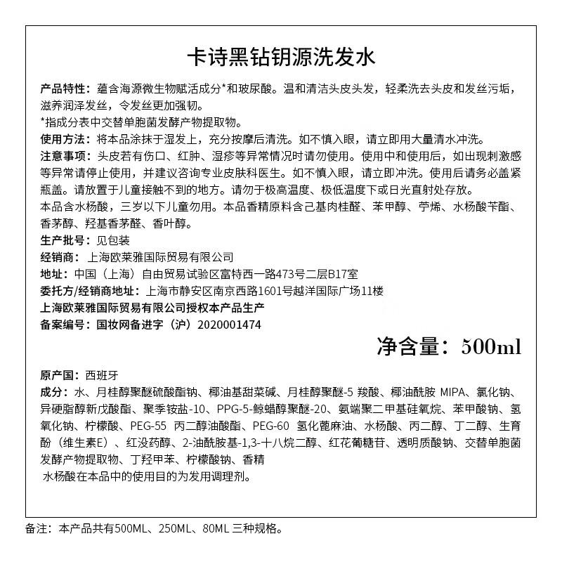 商品标题:卡诗黑钻钥源洗发水250ML(瓶)