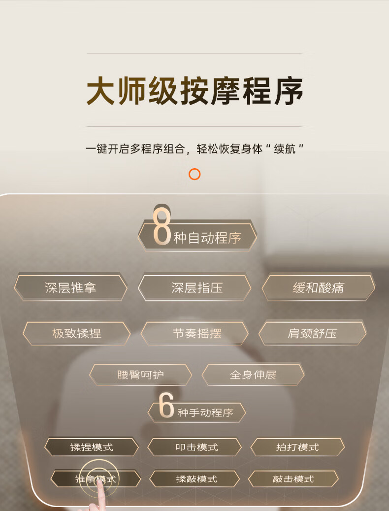 按摩手法:仿人手揉捏;拍打;滚轮揉捏