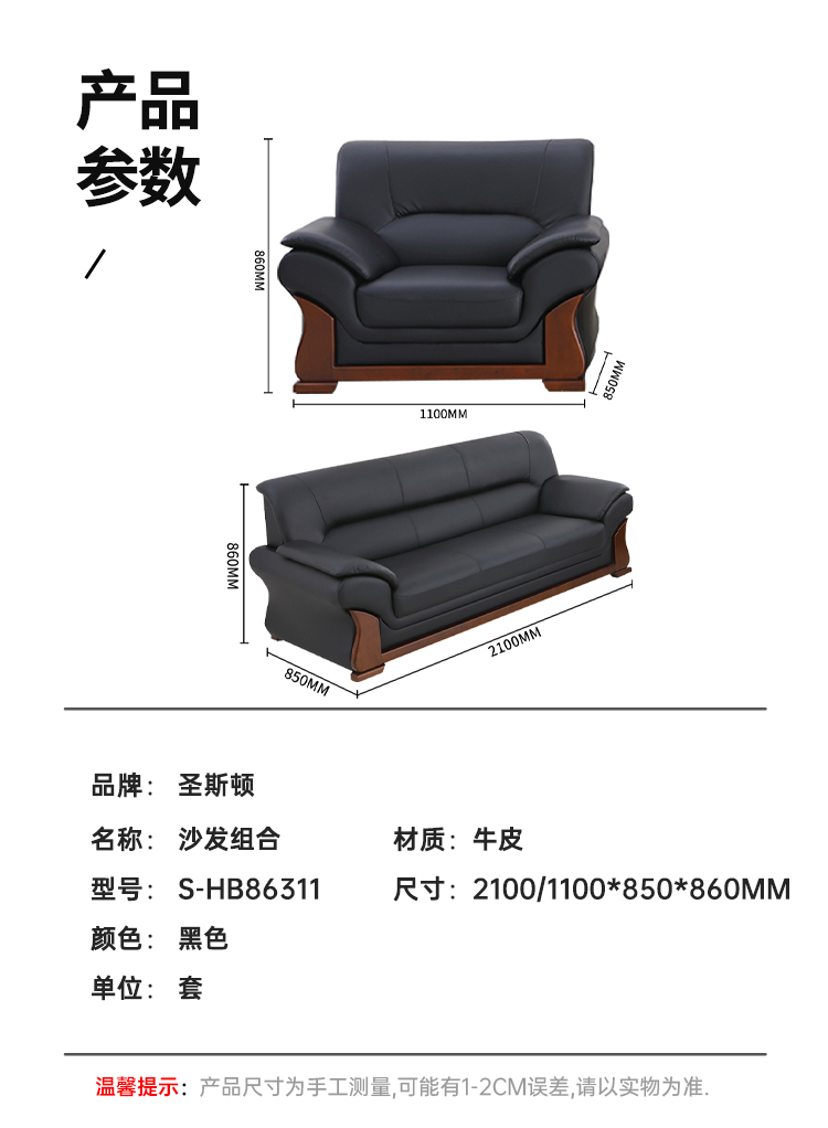 商品标题:圣斯顿S-HB86311中式牛皮沙发3+1+1组合2100/1100*850*860mm(张)黑色