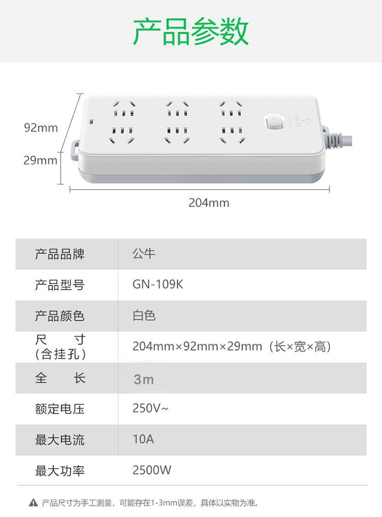 商品标题:公牛GN-109K总控6位插排白色3米30个/箱(个)