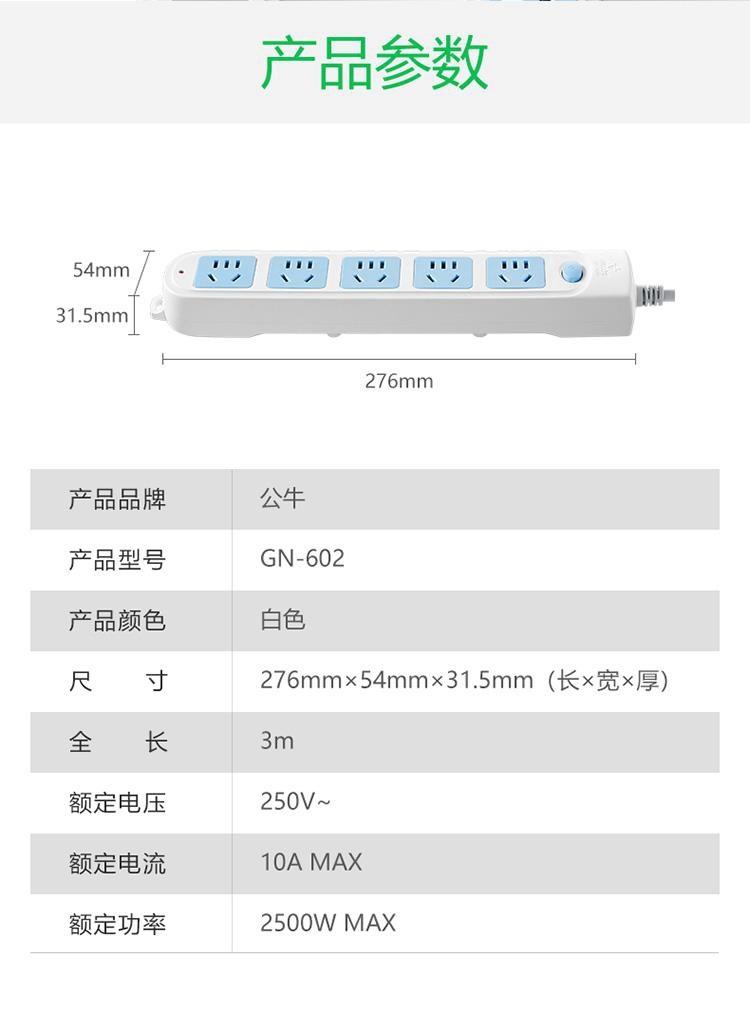 商品标题:公牛GN-602总控5位插排3米32个/箱(个)