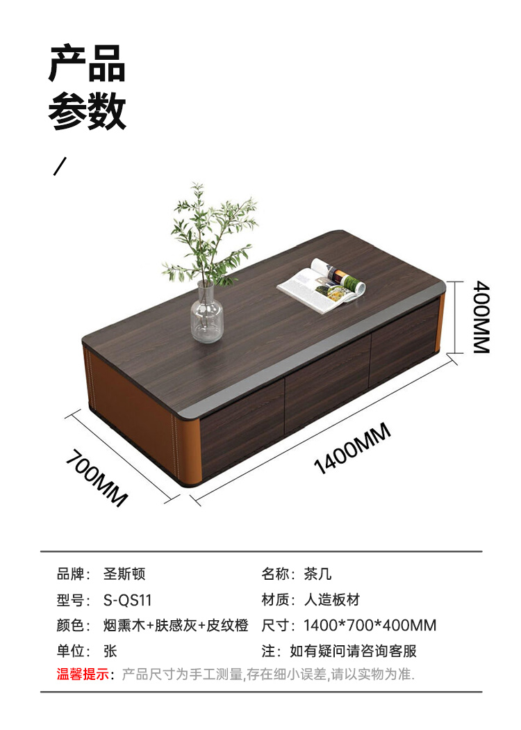 商品标题:圣斯顿S-QS11现代茶几1400*700*400mm(张)烟熏木+肤感灰+皮纹橙