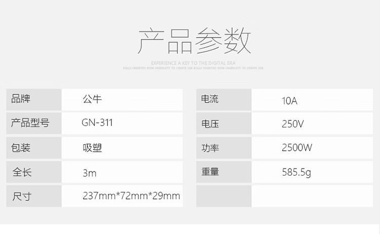 商品标题:公牛GN-311分控4位插排白色3米30个/箱(个)