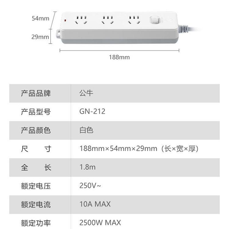 商品标题:公牛GN-212总控3位插排白色1.8米60个/箱(单位:个)