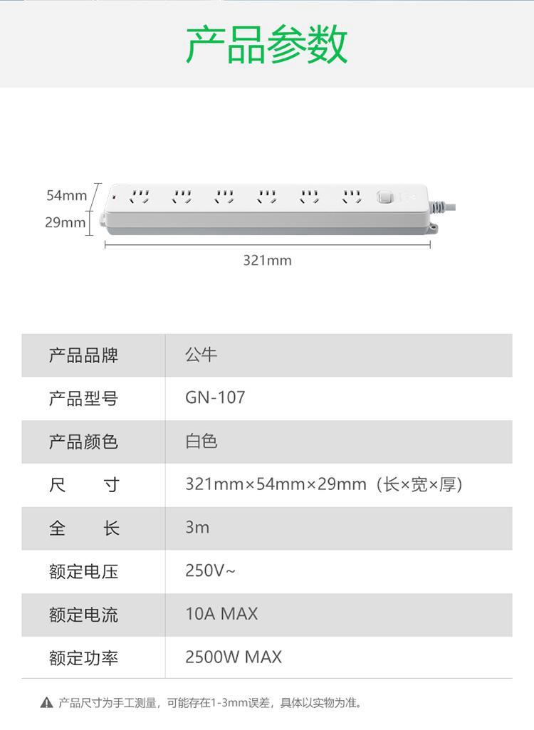 商品标题:公牛GN-107总控6位插排3米(单位:个)