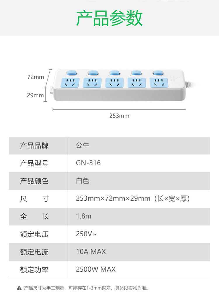 商品标题:公牛GN-316分控5位插排1.8米(单位:个)