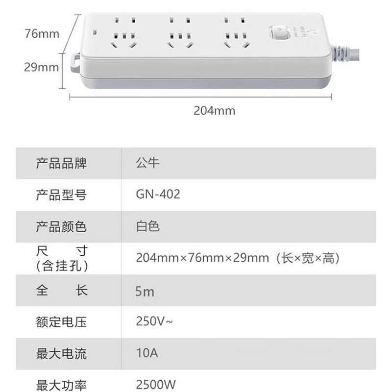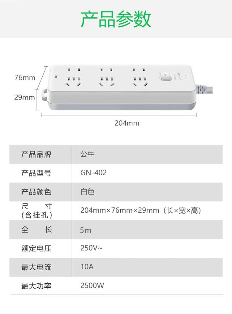 商品标题:公牛GN-402总控6位插排白色5米(个)