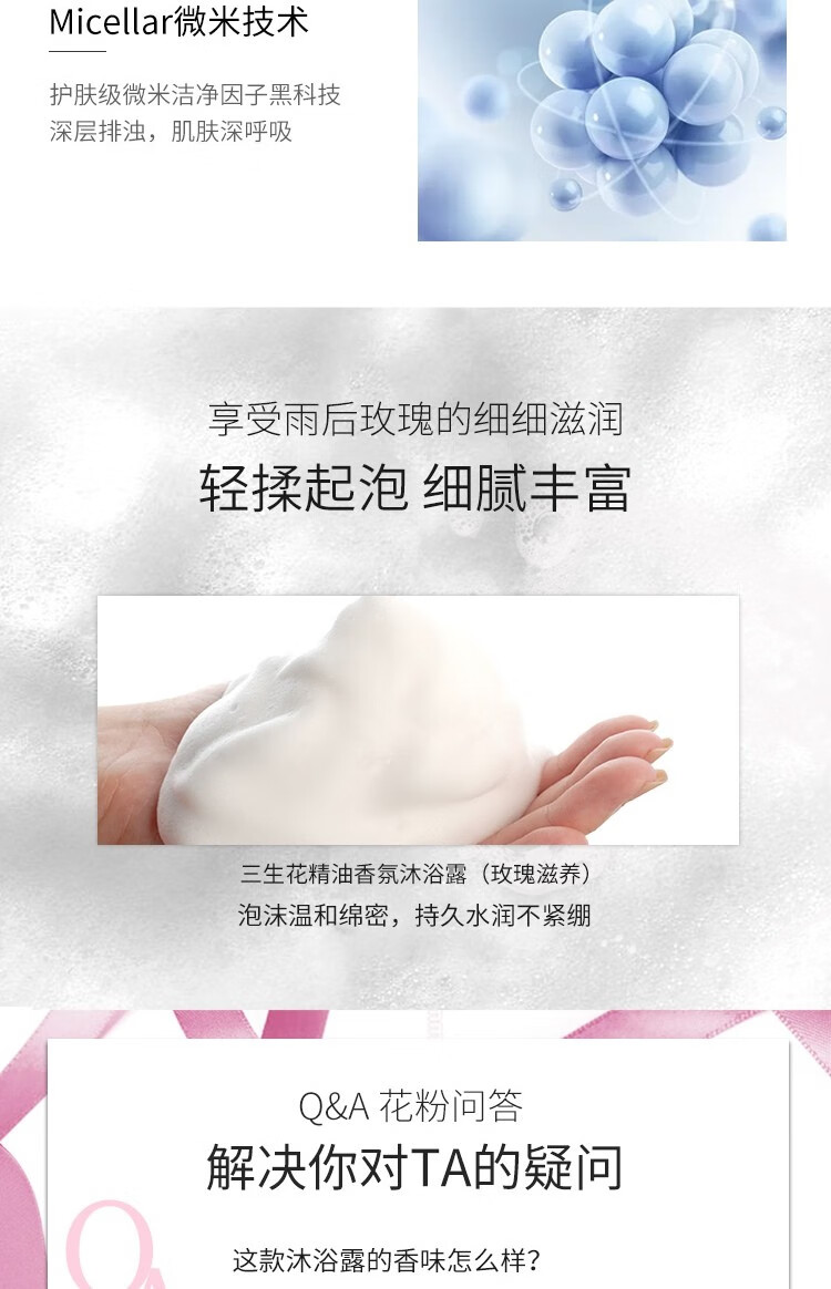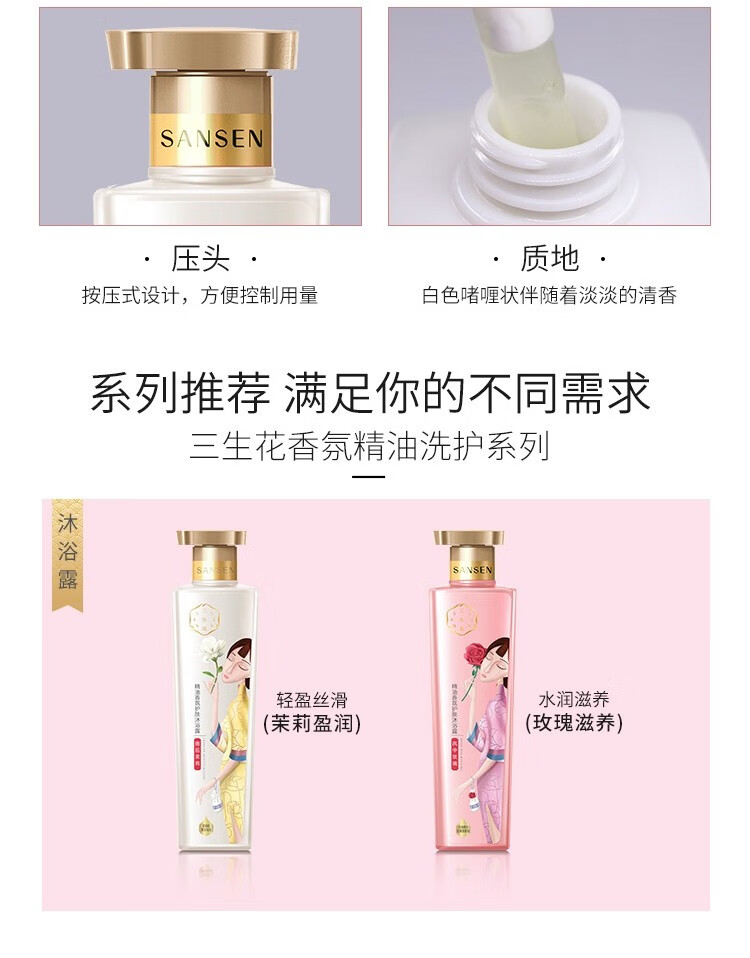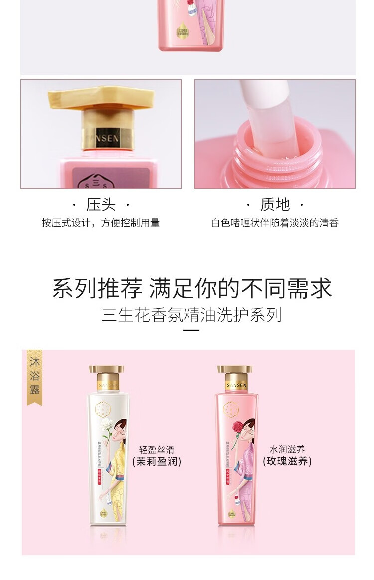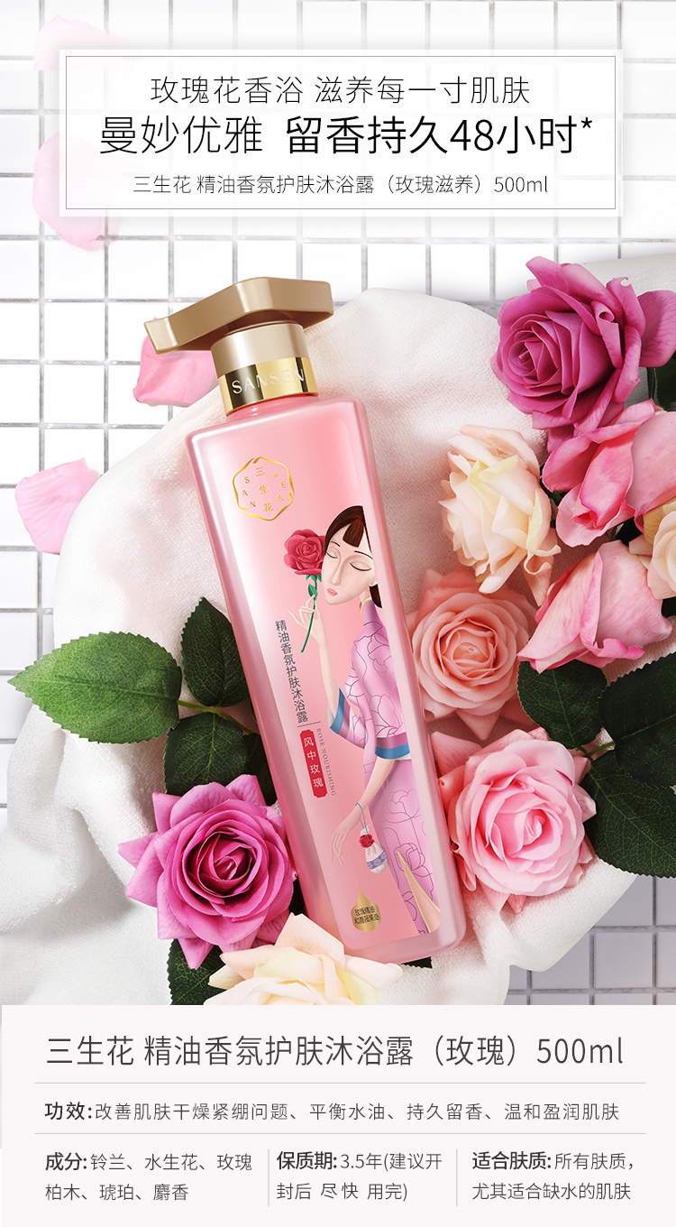 商品标题:百雀羚500ml三生花温和草本精粹 精油香氛护肤沐浴露(玫瑰滋养)(瓶)
