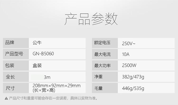 商品标题:公牛GN-B5060总控6位插排 3米(个)
