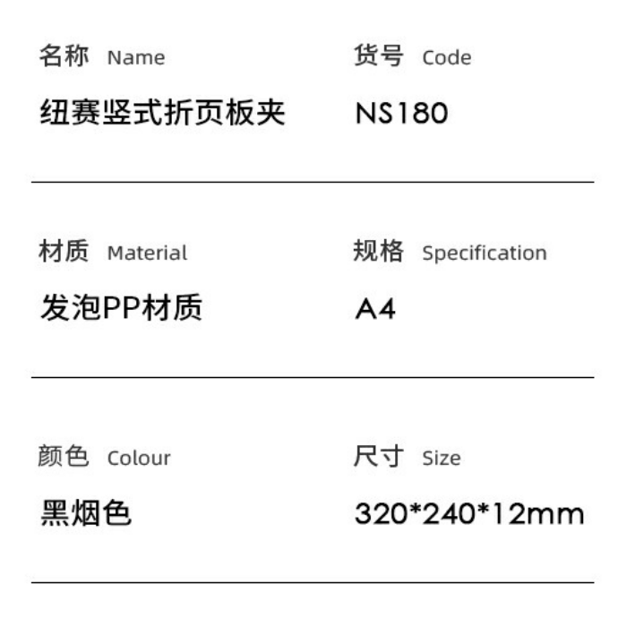 商品标题:得力NS180-纽赛竖款折页板夹(黑烟色)(个)