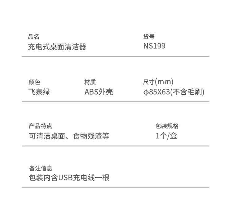 商品标题:纽赛NS199充电式桌面清洁器(飞泉绿)(盒)