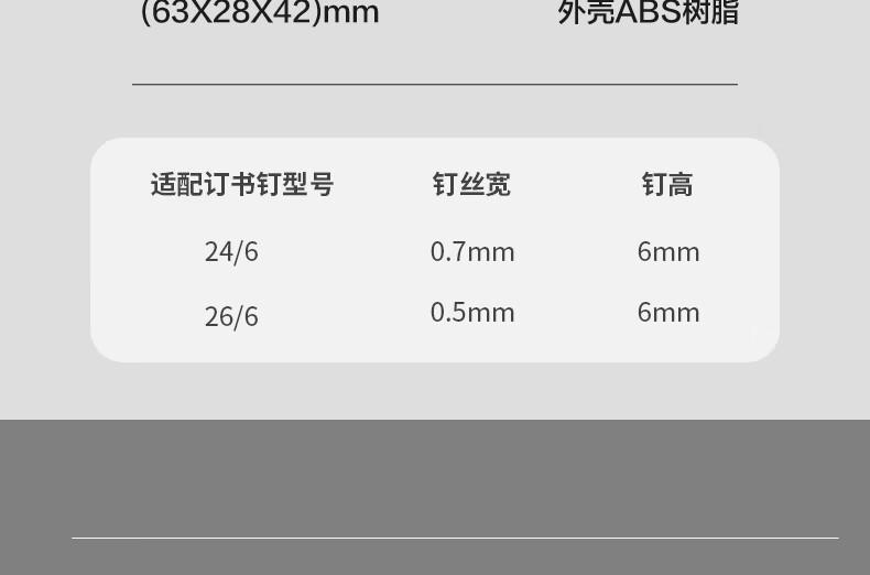 规格尺寸:1台订书机(63X28X42)mm+1盒钉