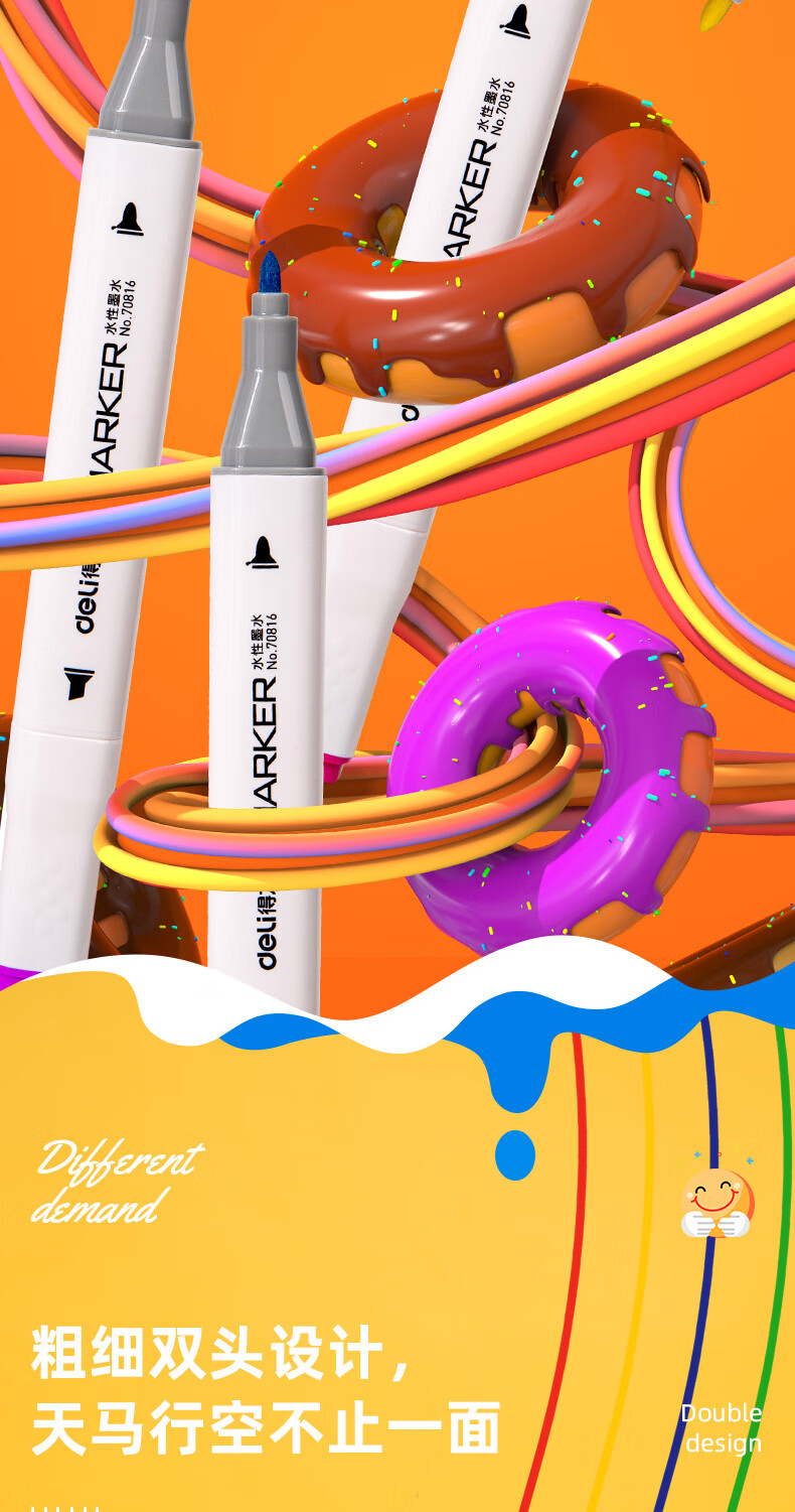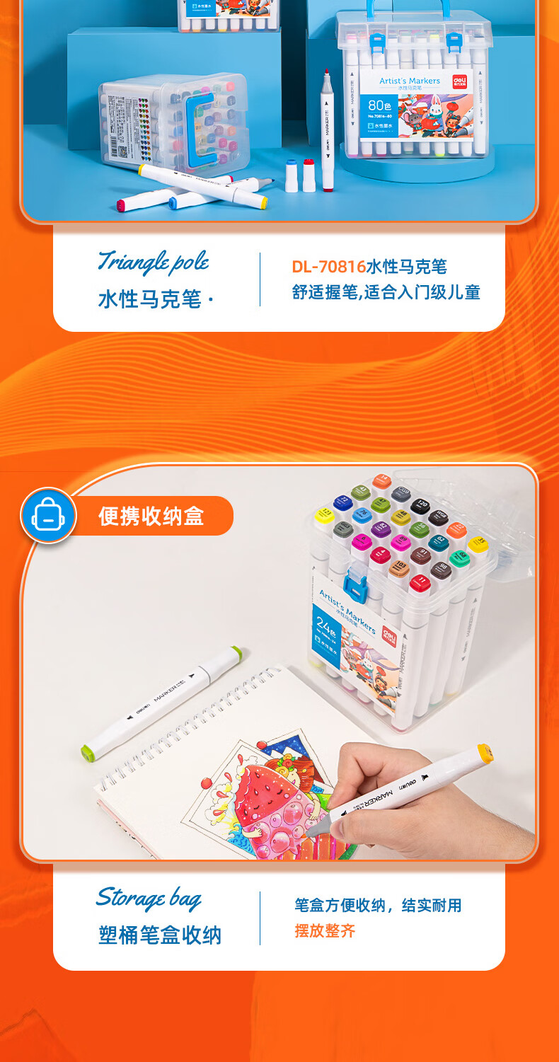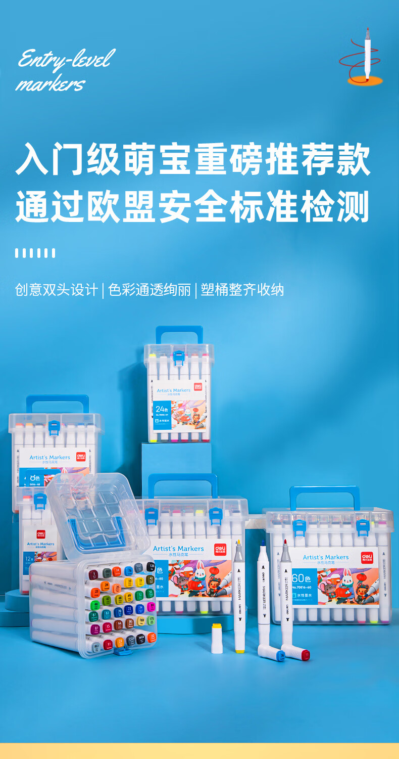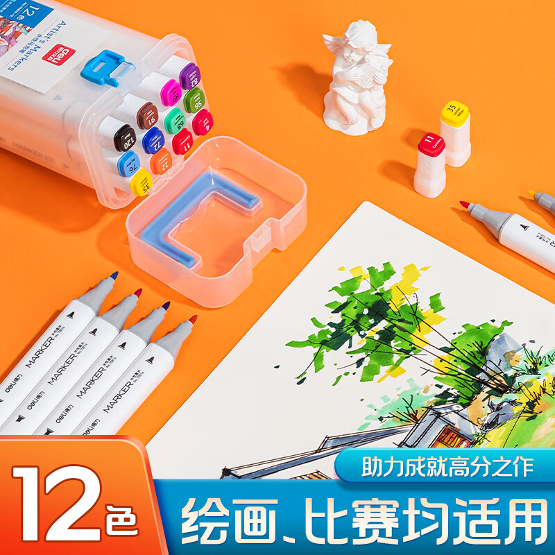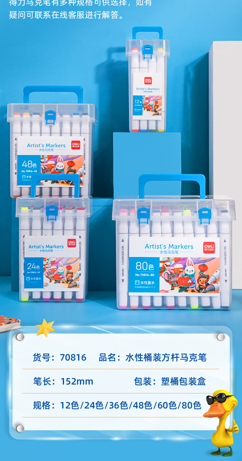 商品标题:得力70816-12_PP桶装水性方杆马克笔(混)(12色/筒)