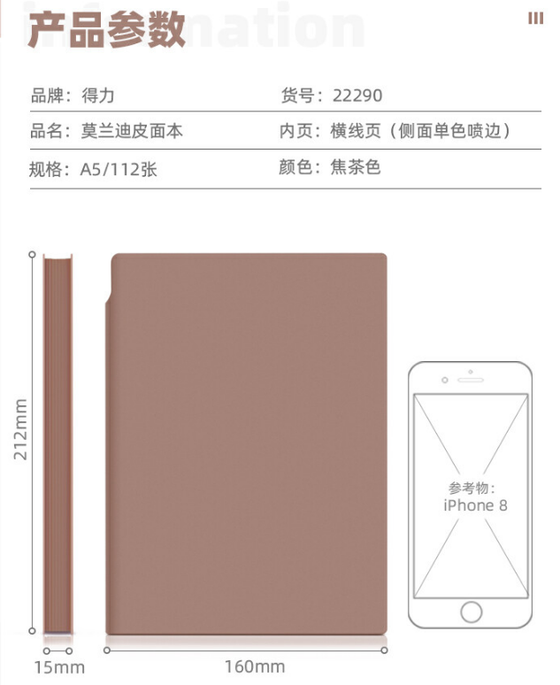 得力22290U型笔插皮面本-A5-210mm*143mm/112张(单位:本)棕