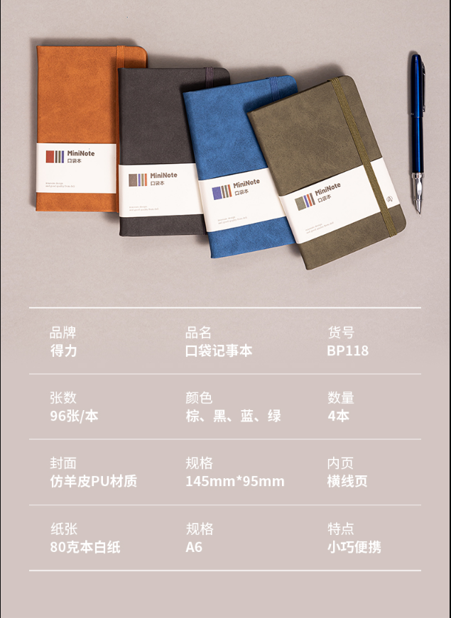 商品标题:得力BP118记事本A6-96张(棕色)(本)