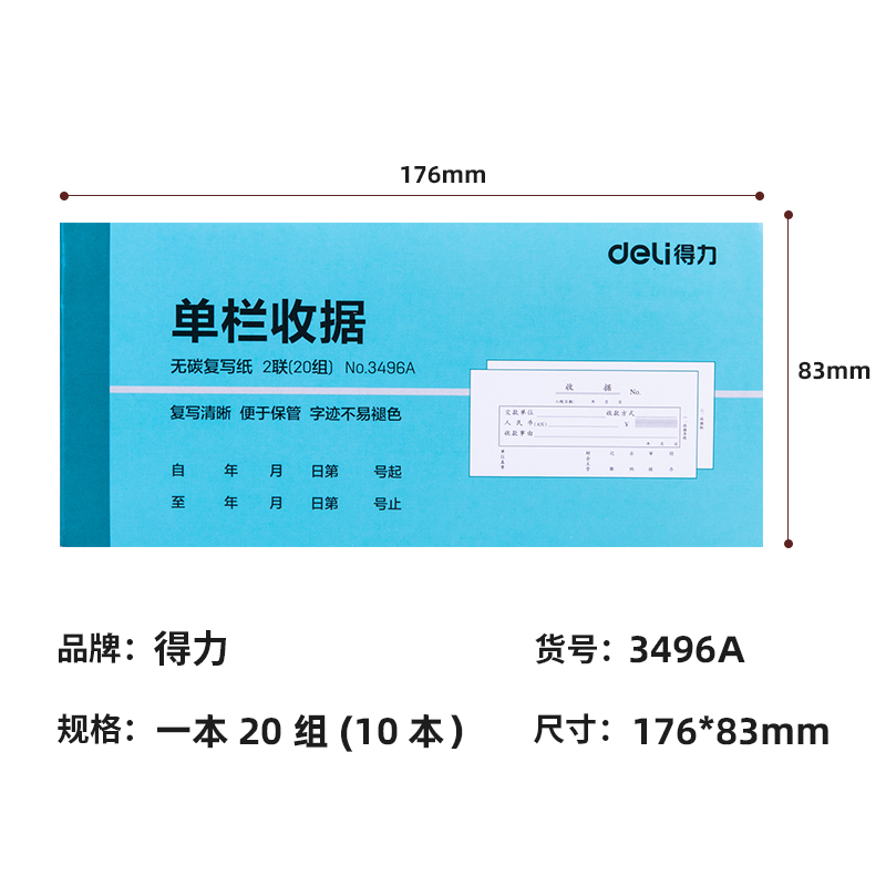 得力3496A二联单栏收据176×83mm/20组(混)(单位:本)