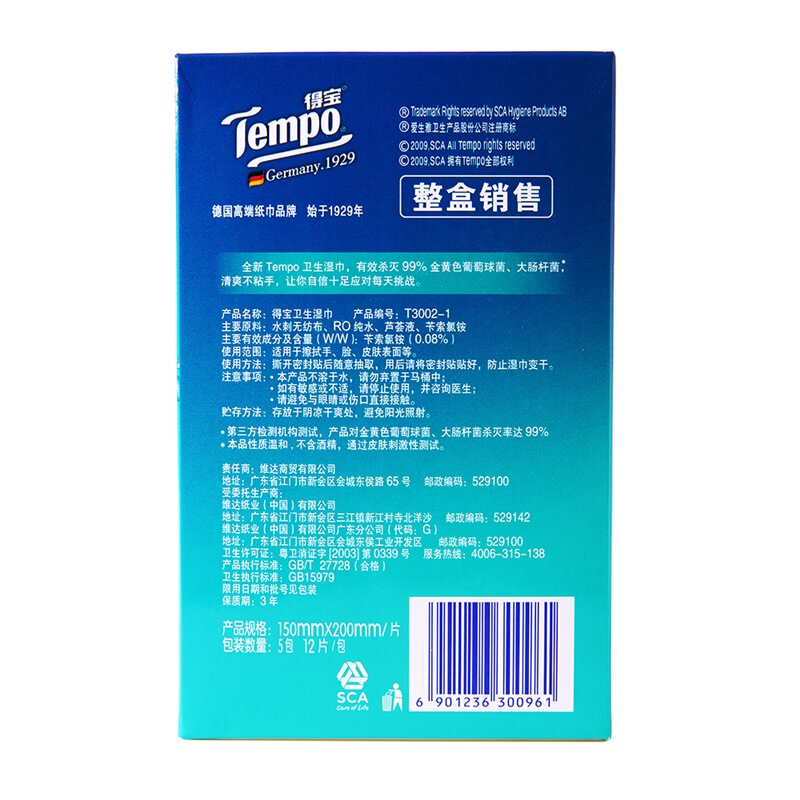 得宝(TEMPO)T3002-1卫生湿巾蓝12/包150*200mm5包/盒/12盒/箱(盒)