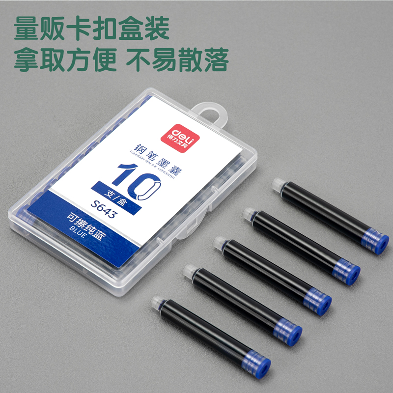 得力S643钢笔墨囊(可擦纯蓝)(10支/盒)