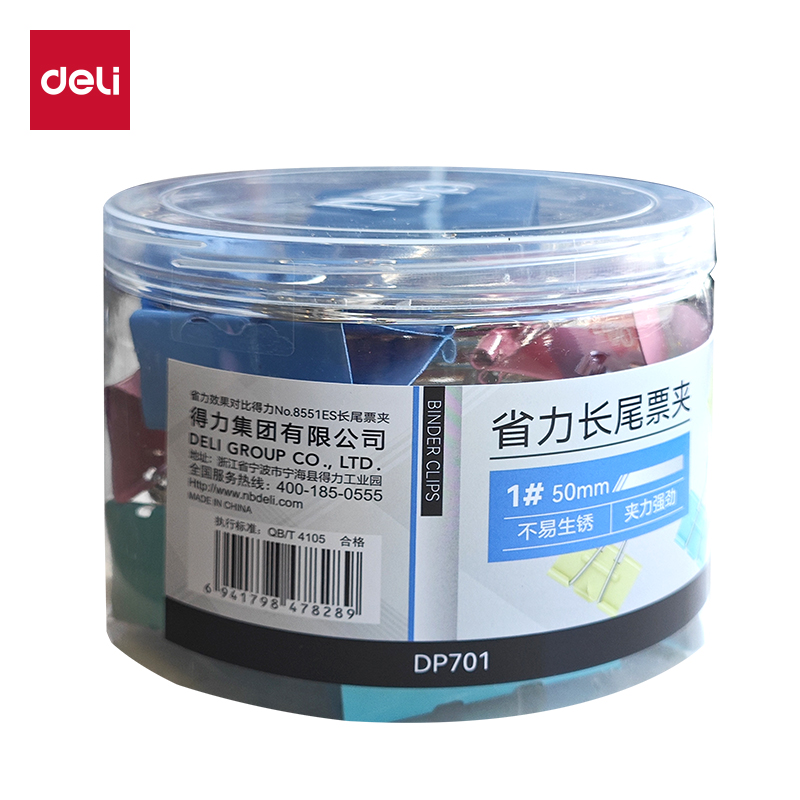 得力省力长尾票夹DP701 1#夹宽50MM(混)(12个/筒)