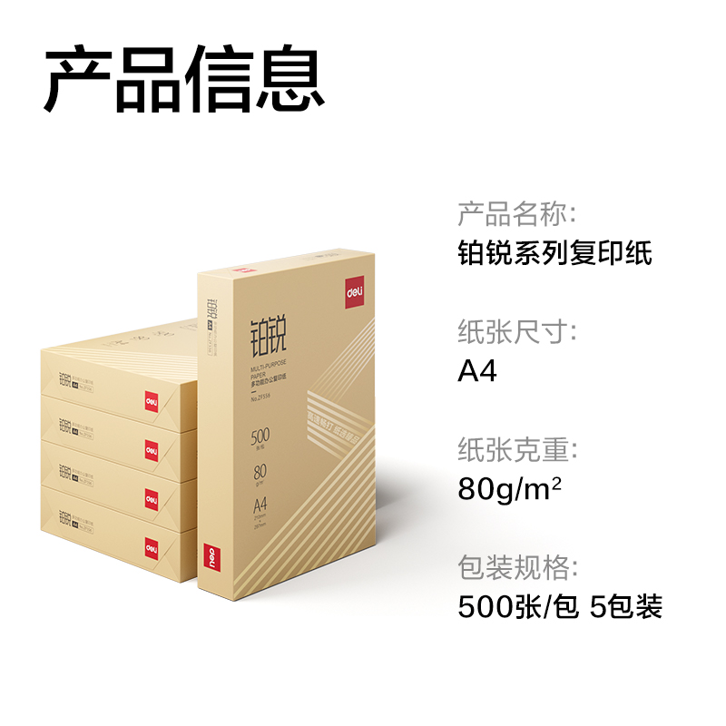 得力ZF557铂锐复印纸A4-80g-5包(金)(包)