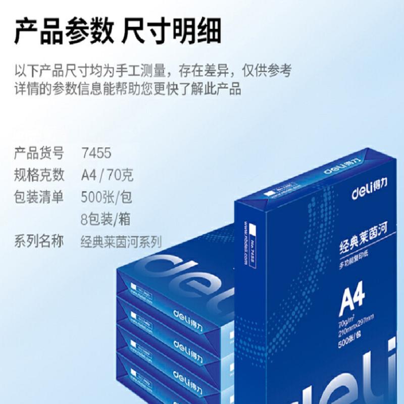 得力7455经典莱茵河复印纸 70克A4 500张/包 8包/箱(单位:包)