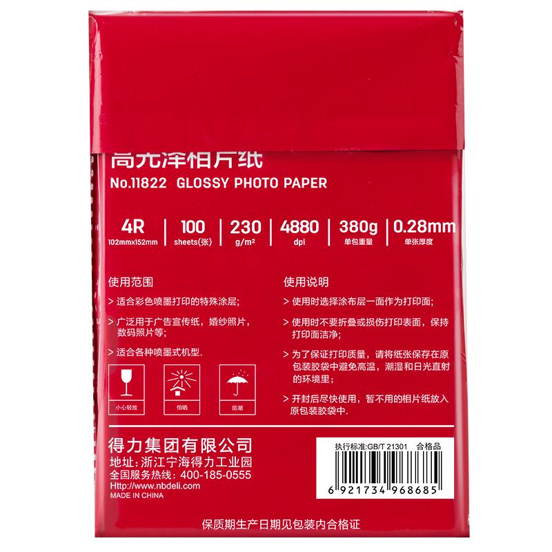得力11822高光相片纸-4R-230g/㎡(白)(100张/袋 单位:袋)
