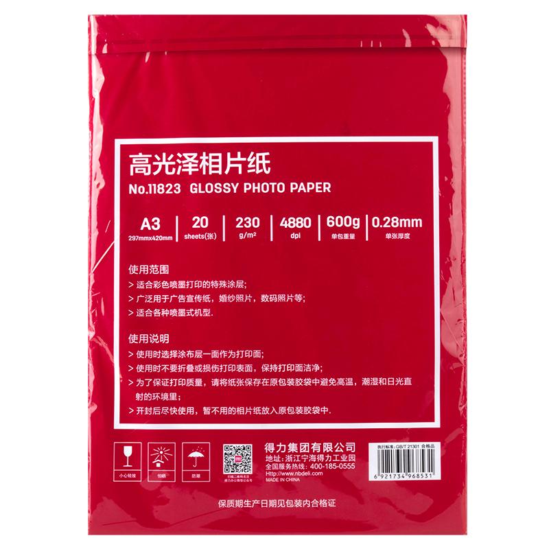 得力(deli)11823高光相片纸-A3-230g/㎡(单位:袋)白