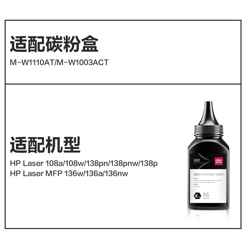 得力(deli)尚影系列兼容M-FW1110A(碳粉瓶)黑色单支装(适用惠普Laser 108a/108w/138pn/138pnw/138p/MFP 136w/136a/136nw)容量:55g(单位:瓶)