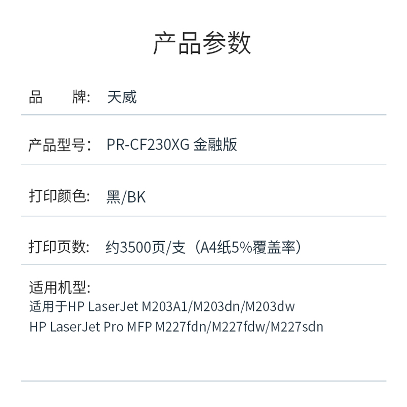 天威兼容PR-CF230XG硒鼓(鼓粉一体)黑色单支装带芯片标准装(适用HP LaserJet M203d/M203dn)打印页数:3500(单位:支)