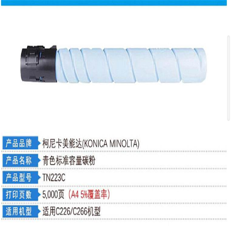 柯尼卡美能达TN223C小容原装碳粉(鼓粉分离)蓝色单支装(个) (适用C226/C266)打印页数:5000墨粉重量:107g