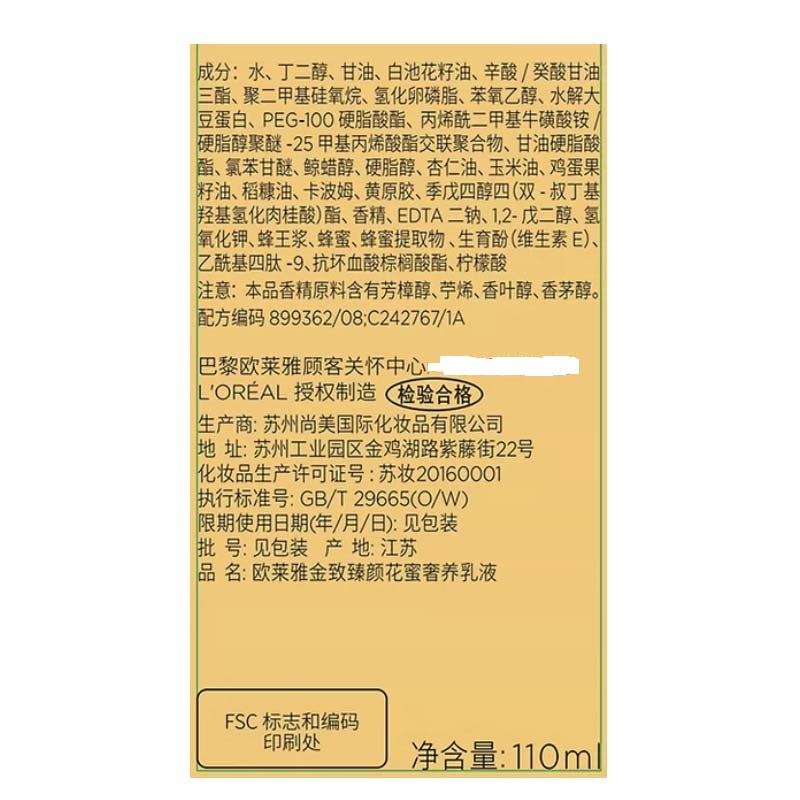 欧莱雅金致臻颜花蜜奢养乳液110ml新老包装随机(单位:瓶)