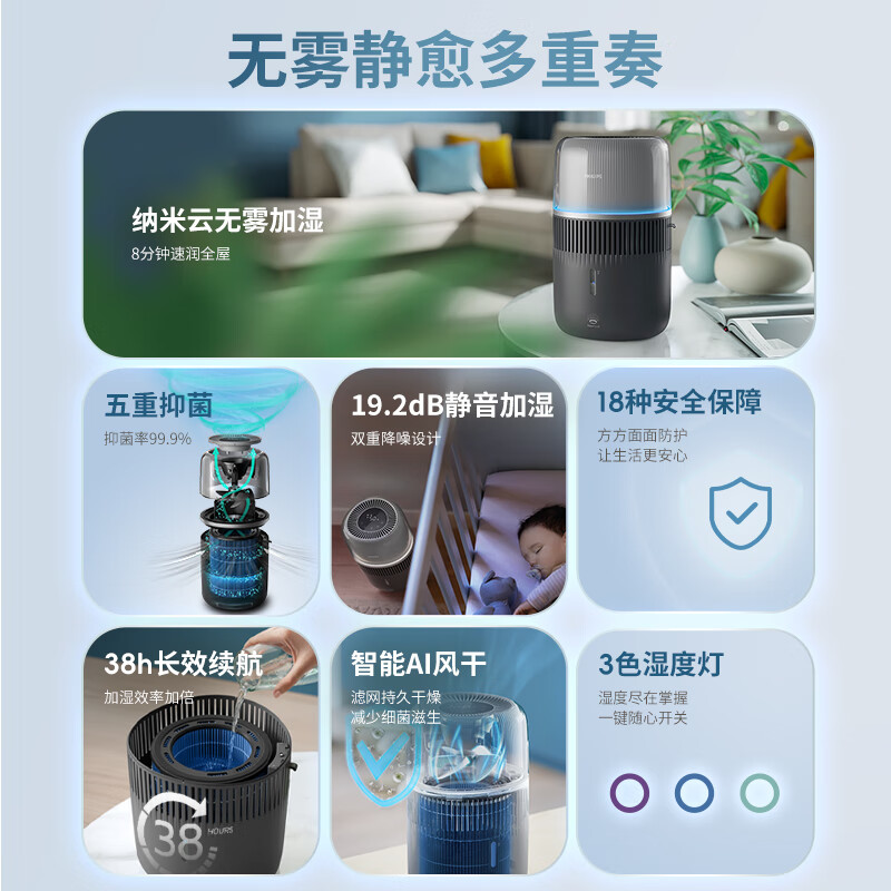飞利浦(PHILIPS)HU5969 加湿器 无雾加湿器 智能调节 大加湿量(单位:台)