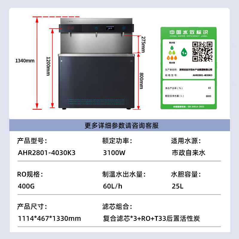 安吉尔(Angel)AHR2801-4030K3 3100W 商用净化加热一体商务直饮机开水器 一级水效(台)